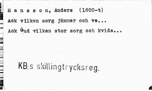 //// i • ' t ~~ Hansson, Anders (1600-t) //// | Ack vilken sorg jämmer och ve,.. //// ~ Ack &ud vilken stor sorg och kvida... //// i KB:S skillingtrycksreg. //// r i ////