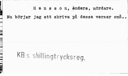 //// i //// Hansson, Anders, mördare. = Nu börjar jag att skriva p& dessa versar små.. //// j KB s skillingtrycksreg. //// ¦i ¦ //// ¦ ¦ ////