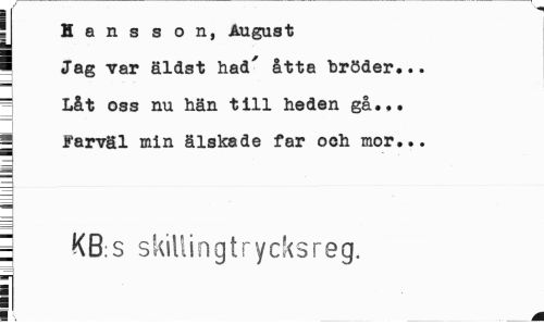 //// Hans s o n, August ! Jag var äldst had' åtta bröder... //// Låt oss nu hän till heden gå... | Farväl min älskade far och mor... //// I KB s skillingtrycksreg. //// I k A ////