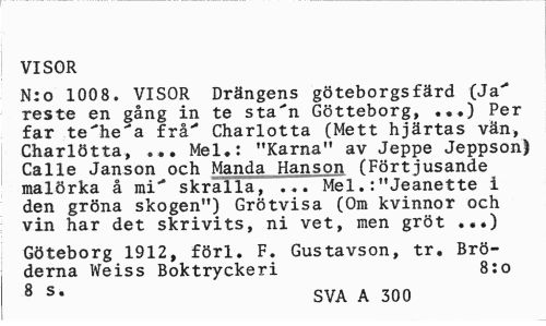 //// VISOR //// N:o 100 8. VISOR Drängens göteborgsfärd (Ja" reste en gång in te sta'n Götteborg, ...) Per far te"he'a frå" Charlotta (Mett hjärtas vän, Charlötta, ... Mel.: "Karna" av Jeppe Jeppson) Calle Janson och Manda Hanson (Förtjusande malörka å mi" skralla, ... Mel.:"Jeanette i den gröna skogen") Grötvisa (Om kvinnor och vin har det skrivits, ni vet, men gröt ...) //// Göteborg 1912, förl. F. Gustavson, tr. Bröderna Weiss Boktryckeri 8:0 //// 8 s* SVA A 300 ////