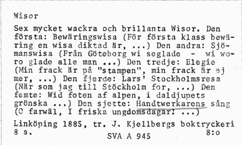 //// Wisor //// Sex mycket wackra och brillanta Wisor. Den första: Bewäringswisa (För första klass bewä-ring en wisa diktad är, Den andra: Sjö- //// manswisa (Från Göteborg wi seglade - wi voro glade alle man ...) Den tredje: Elegis (Min frack är på "stampen", min frack är ej mer, ...) Den fjerde: Lars' Stockholmsresa (När som jag till Stockholm for, ...) Den femte: Wid foten af alpen, i daldjupets grönska ...) Den sjette: Handtwerkarens sång (0 farwäl, I friska ungdomådagä*] i'.. J" //// Linköping 1885, tr. J. Kjellbergs boktryckeri //// 8 S* SVA A 945 8:0 ////