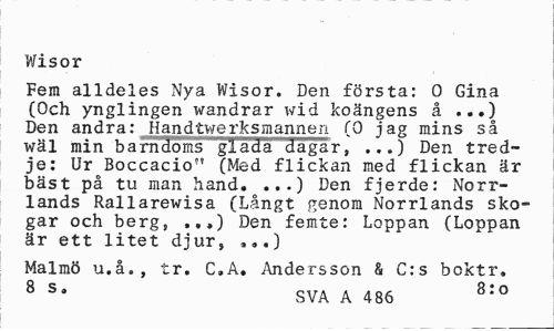 //// V/is or //// Fem alldeles Nya Wisor. Den första: 0 Gina (Och ynglingen wandrar wid koängens å ...) Den andra: Handtwerksmannen (0 jag mins så wäl min barndoms glada dagar, ...) Den tredje: Ur Boccacio" (Med flickan med flickan är bäst på tu man hand. ...) Den fjerde: Norrlands Rallarewisa (Långt genom Norrlands skogar och berg, ,.,) Den femte: Loppan (Loppan är ett litet djur, „,.) //// Malmö u.å., tr. C.A. Andersson & C:s boktr. 8 S* SVA A 486 8:0 ////