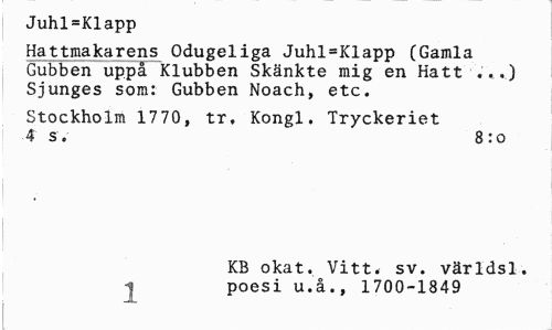 //// Juhl^Klapp //// Hattmakarens Odugeliga Juhl=Klapp (Gamla Gubben uppå Klubben Skänkte mig en Hatt ...) Sjunges som: Gubben Noach, etc. //// Stockholm 1770, tr, Kongl. Tryckeriet 4 s. 8:0 //// KB okat. Vitt. sv. världsl. poesi u.å., 1700-1849 ////