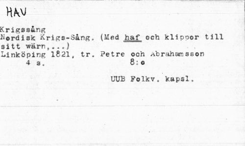//// H KM //// Crigssång //// Gordisk Krigs-Sång. (Med haf och klippor till sitt wärn,...) //// Linköping 1821„ tr. Petre och Abrahamsson 4 3. 8:o //// UUB Folkv. kapsl. ////