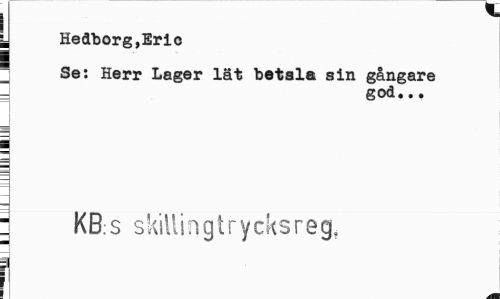 //// , Hedborg,Eric //// " Se: Herr Lager lät betala sin gångare _ god... //// i //// : KB.s skillingtrycksreg, //// i i ////