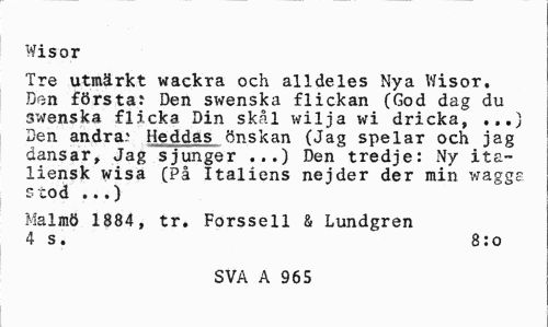 //// Wisor //// Tre utmärkt wackra och alldeles Nya Wisor. Den förstår Den swenska flickan (God dag du swenska flicka Din skål wilja wi dricka, .,.) Den andra.' Heddas önskan (Jag spelar och jag dansar, Jag sjunger ...) Den tredje: Ny italiensk wisa (På Italiens nejder der min waggs stod ...) //// Malmö 1884, tr. Forssell & Lundgren 4 s. 8:0 //// SVA A 965 ////