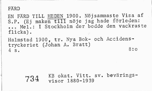 //// FARD //// EN FÄRD TILL HEDEN 1900. Nöjsammaste Visa af S.P. (Ej maken till nöie jag hade förleden: ... Mel.: I Stockholm der bodde den vackraste flicka). //// Halmstad 1900, tr. Nya Bok- och Accidens-tryckeriet (Johan A. Bratt) 4 s. 8:o //// KB okat. Vitt. sv. bevärings-t visor 1880-1939 ////