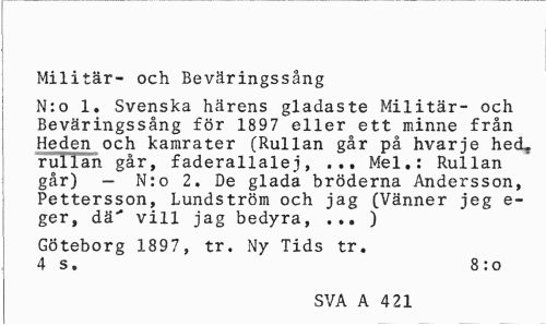 //// Militär- och Beväringssång //// N:o 1. Svenska härens gladaste Militär- och Beväringssång för 1897 eller ett minne från Heden och kamrater (Rullan går på hvarje hed, rullan går, faderallalej, ... Mel.: Rullan går) — N:o 2. De glada bröderna Andersson, Pettersson, Lundström och jag (Vänner jeg e-ger, dä' vill jag bedyra, ... ) //// Göteborg 1897, tr. Ny Tids tr. 4 s. 8 :o //// SVA A 4 21 ////