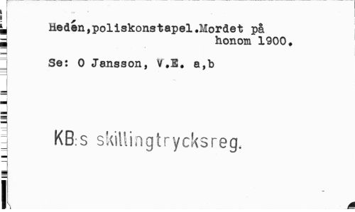 //// J Heden,poliskonstapel.Mordet på //// I honom 1900. //// ^ Se: 0 Jansson, V.E. a,b : //// 5 KB s skillingtrycksreg, //// i ////