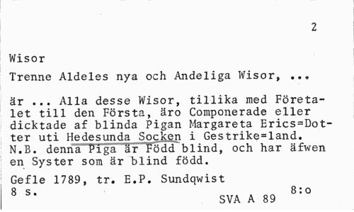 //// 2 //// Wisor //// Trenne Aldeles nya och Andeliga Wisor, . //// är ... Alla desse Wisor, tillika med Företalet till den Första, äro Componerade eller dicktade af blinda Pigan Margareta Erics=Dot-ter uti Hedesunda Socken i Gestrike=land. N.B. denna Piga är Född blind, och har äfwen en Syster som är blind född. //// Gefle 1789, tr. E.P. Sundqwist //// 8 s. 8:o //// SVA A 89 ////