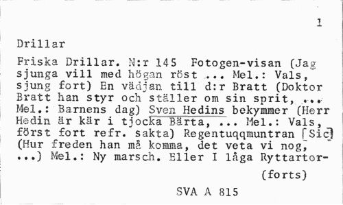 //// 2 //// Drillar //// Friska Drillar. N:r 145 Fotogen-visan (Jag sjunga vill med högan röst ... Mel.: Vals, sjung fort) En vädjan till d:r Bratt (Doktor Bratt han styr och ställer om sin sprit, ... Mel.: Barnens dag) Sven. Hedins bekymmer (Herr Hedin är kär i tjocka Bärta, ... Mel.: Vals, först fort refr. sakta) Regentuqqmuntran [Sicl (Hur freden han må komma, det veta vi nog^ ...) Mel.: Ny marsch. Eller I låga Ryttartor- //// (forts) //// SVA A 815 ////