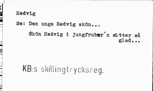 //// I //// j Hedvig //// _ Se: Den unga Hedvig skön... //// Skön Hedvig i jungfrubär'n si/tter så //// glad... //// ¦ //// i //// 3 KB:S skillingtrycksreg. ////