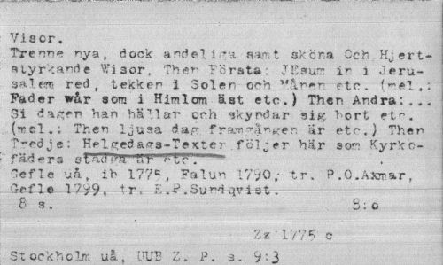 //// Visor. //// Trenn* rya, dock andel i najr.t skena Cch Hj ert-styrkande Wi sor, The»- Törsta; JEsum ir i Jerusalem red, tekken i Solen och ""a^-r etc. Fader wår sora i Himlom äst etc.) Then Andra:... Si da^er han hällar orh skyndar hört et". (mel.; Then ljusa dar. fram^åntcen ar etr.) Then Tredje: Helgeda^s-Textet följer här som Kyrkc-fäders stat1! ^""HA-...*IT.1""""" //// Gefle ua, ib 177c , Falun 17*0; tr. P.O.Axmar, Gefle 1799» ir, E.^.Sundqvist. 6 s. 8:o //// Zz '1775 c Stockholm uå [TUB Z. P. a. 9: } ////