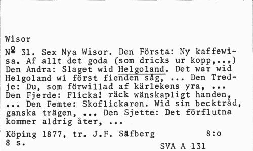 //// Wisor //// N- 31. Sex Nya Wisor. Den Första: Ny kaffewi-sa. Af allt det goda (som dricks ur kopp,..f) Den Andra: Slaget wid Helgoland. Det war wid Helgoland wi först fienden såg, ... Den Tredje: Du, som förwillad af kärlekens yra, ... Den Fjerde: Flickal räck wänskapligt handen? ... Den Femte: Skoflickaren. Wid sin becktråd, ganska trägen, ... Den Sjette: Det förflutna kommer aldrig åter, ... //// Köping 1877, tr. J.F. Säfberg 8:0 //// 8 S' SVA A 1 ////
