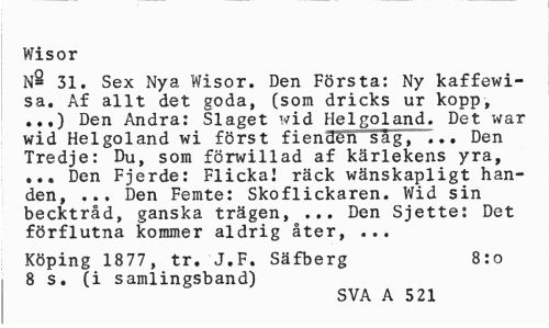//// Wisor //// 31. Sex Nya Wisor. Den Första: Ny kaffewi-sa. Af allt det goda, (som dricks ur kopp, ..,) Den Andra: Slaget x^id Helgoland. Det war wid Helgoland wi först fienden sag, ... Den Tredje: Du, som förwillad af kärlekens yra, ... Den Fjerde: Flicka! räck wänskapligt handen, ... Den Femte: Skoflickåren. Wid sin becktråd, ganska trägen, ... Den Sjette: Det förflutna kommer aldrig åter, ... //// Köping 1877, tr. J.F. Säfberg 8:0 //// 8 s. (i samlingsband) //// SVA A 521 ////