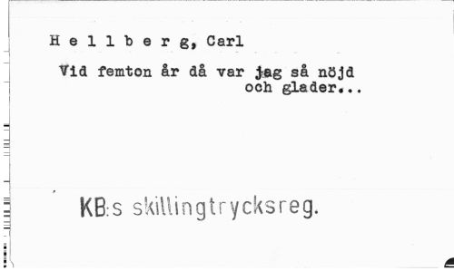 //// Hellberg, Carl //// Vid femton år då var $ag så nöjd //// och gläder... //// - //// = KB:S skillingtrycksreg. //// ¦ i ////