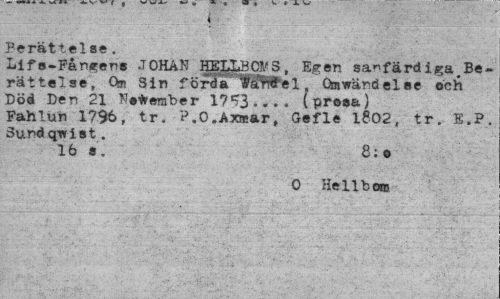 //// t //// Berättelse. //// Lif s-Fån«;ens JOHAN HELLBC1V3 , Egen sa^färd i^a,Berättelse, Om Sin förda ¦nmt i. Cöiwändelee och Död Den 21 N«*eraber 17^3... (prosa) Fahluri 17^6, tr. P.O.Axmar, Gefle 1802, tr. E.P, Sundqwi st. //// 16 s. 8;© //// O He11boro ////