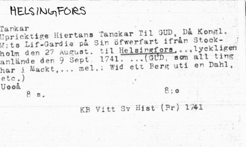 //// HEU/Mt^Fö&S //// Tankar //// Upricktige Hiertana Tanokar Til GUD, Då Kongl. MT; t s Lif-Gardie på Sin öfwerfart ifrån Stockholm den 27 August, til Helsingfors...lyckligen anlände den 9 Sept 1741, ...(GUD, som all ting har i Mackt,... mel.; Wid ett Berg uti en Dahl, etc.) Uooå //// B b, B t o //// KB Vitt Sv Hist (Pr) 1/"41 ////