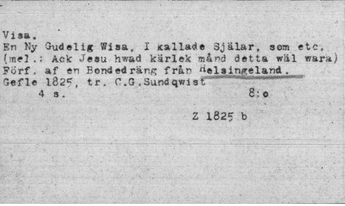 //// Visa, //// En Ny Gudelig Wisa, I Kallade Själar, som etc, (<nel.; Ack Jesu hw&d kärlek månd detta wäl wara) Förf. af en Bondedräng frän rteis idéland . Gefle 1825, tr, C .G . Sund qwist —— 4 s . 8:0 //// 2 1825 b ////
