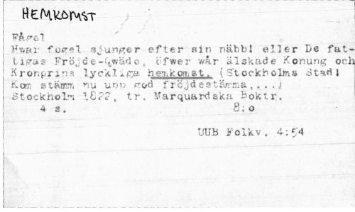 //// tfE/Xmnvr //// Få^el //// Hv.ar foereX sjunger efter sin näbbl eller Le fat' tigas Fröjde-(twädc , c'fwer war älskade Konung oci Kronprins lyckliga h ei, k onr. a t. (Stockholms di t ad ) Kom stämrr. nu uo» ~od fröjdest&rma,.. . i Stockholm 18??, tr. Marquardska Boktr, 4 2. ' 8;o //// UUB Folkv, ////