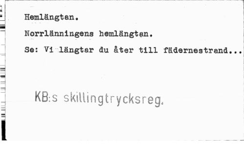 //// I //// 1 Hemlängtan. //// Norrlänningens hemlängtan. //// Se: Vi längtar du åter till fädernestrand... //// I KB:s skillingtrycksreg, //// i ////