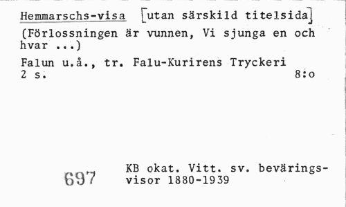 //// Hemmarschs-visa [utan särskild titelsida] //// (Förlossningen är vunnen, Vi sjunga en och hvar ...) //// Falun u.å., tr. Falu-Kurirens Tryckeri 2 s. 8:0 //// KB okat. Vitt. sv. bevärings-b«3 7 visor 1880-1939 ////