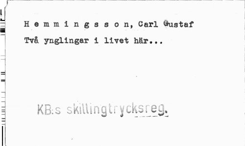 //// = Hemmingsson, Carl Gustaf Två ynglingar i livet här... //// i KB:S skillingtrycksreg. ////