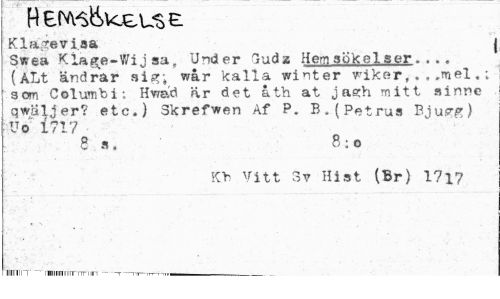 //// Kla.teviaa j //// Swea Kla^e-Wijsa, Under Grudz Hem sökelser. . .. (ALt ändrar sisr» war kalla winter wiker,. . .mel.; 3 om Columbi: Hwad är det åth at j as;h mitt ainre qwäljer? etc.) Skrefwen Af P. B. (Petrus Bju<?e) ¦Uo 1717 //// 8 «. B:o //// Kb Vitt Hist (Br) 1?17 //// « s //// niirnin' ~ mmiraiinnr-nrnn ---t...-~i-ir—rrr-.-nn.i --- ////