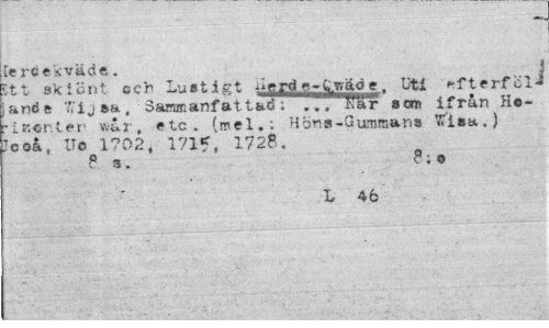 //// leréekväde. //// St t sk i 15 n t cch Lustigt ilerde-tpw&de. Uti *fterfcl-i <»nöft 7,'ij s& , Sajnmanfattfcé : .!!. TSar som ifrån H«- //// •iK-er.ter wår , *tc . (trel.; Höns-Gummans .) //// Jcoå, Ho 1702, 1715, 1728. //// ? 3. 8;o //// L 46 ////