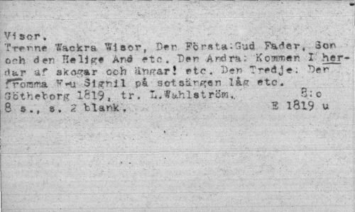 //// Vi sor. //// Trernt Taekra Wisor, Der Först»:Gud Fa^er, Son och den Helige avé etc. Den Andra: Kpmw«h X; herdar af skogar och änf?ar! etc. Den Tredje; Der fromma ""-ti Stsrnil på sotsängen Ietc. GötheVorg 1819, tr. L.fahUtröPi,. B: c //// 8 s., s. 2 blank. B 1819 u ////