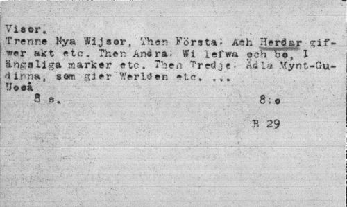 //// Visor. //// Trenne Nya Wijsor, a hon Körstai ath Herdar gif~ wer akt etc. Ther Andra: Wi lefwa ocnToT I ängsliga marker etc. The »i Tredje, Ädla Myn t-Gudinna, som gier Werlden etc. ... TJooå //// 6 s. 8 ; o //// B 29 ////
