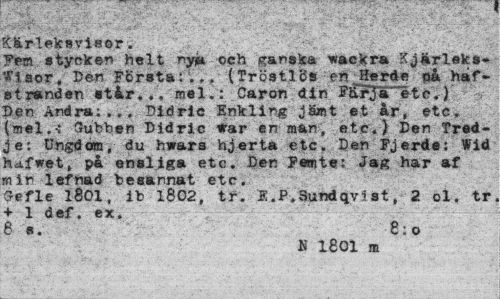 //// Kärleksvisor. //// Fe» stycken helt r>ym och ganska waekra X^ärleki-«1.sor, Den Första:1.,, (Tröstlös en_Herde iså håf-stranden står. .. mel.: Caron din Färja etc.) Den Andra;.,. Bidrie Enklirg jämt et år, etc. (mel.-: Gubben Didric. tar en man, etc.) Den Tredje: Ungdom, du hwars hjerta etc. Den Fjerde: Wid hafwet, på ensliga etc. Den Femte: Jag har af min lefnad besannat etc. //// Serie 1801, ib 1802, tr. E.P,Sundqvist, 2 ol. tr + 1 def. ex. //// 8 «. 8:0 //// B 1801 m ////