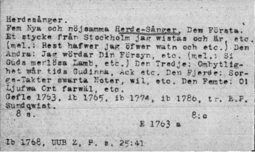 //// Herd esarger . % //// Fem Nya och nöjsamma Herdjs-Sånger. Be» Första. Et stycke från Stockholm jap wistas och är etc, (mel.; Hest hafwer Jag öfwer watn och etc.) Den Andra; Jag wördar Din Försyn, etc. (mel. t Si Guds merlösa Lsunb, etc.) Der Tredje; Ombytlig-hftt wår tid» Gudinr.a, Ack etc. Den Fjerde; Sor-ge-Takter svarta Hoter, wi1, etc. Den Ferate; 01 Ljufwa Crt farwäl, etc. //// Gefle 1763, it 1765, ib 177*, ib 1786, tr. E.F. Surdqwiat. //// 8 s. 8; o //// E 1763 a //// Ib 1768, UIIB Z, P. s. 2<~;41 ////