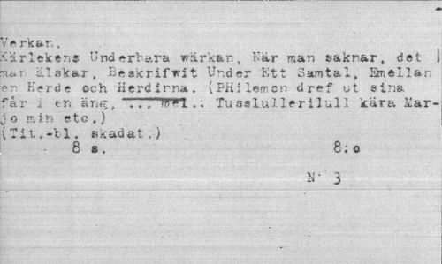 //// ¦/> rk u r,. //// (ärlekerj* Underbara wärkar. Kär man saknar, det i n«.i älskar, Beakrifwit Under Ett Samtal, Bnellan //// Kerde och Herdirna, (PHilemon dref ut .sina rår i tr. äng, '"Hl.. Tusslullerilull kära ar-Jo min etc.) i Ti t.-bl. skadat.) //// 8 s. 8;o //// N- 3 ////
