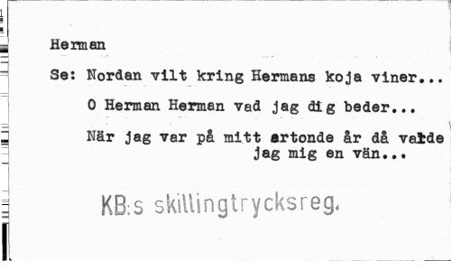 //// _ //// , Herman //// H //// = Se: Nordan vilt kring Hermans koja viner... //// 0 Herman Herman vad jag dig beder... //// 2 När jag var på mitt artonde år då valde //// jag mig en vän..* //// KB:S skillingtrycksreg, //// i ////