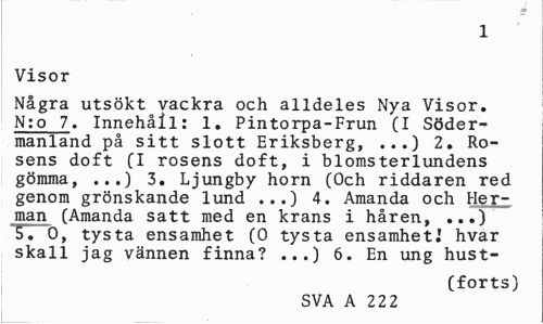 //// 1 //// Visor //// Några utsökt vackra och alldeles Nya Visor. N:o 7. Innehåll: 1. Pintorpa-Frun (I Södermanland på sitt slott Eriksberg, ...) 2. Rosens doft (I rosens doft, i blomsterlundens gömma, ...) 3. Ljungby horn (Och riddaren red genom grönskande lund ...) 4. Amanda och Her-man (Amanda satt med en krans i håren, ...) T. 0, tysta ensamhet (0 tysta ensamhet.1 hvar skall jag vännen finna? ...) 6. En ung hust- //// (forts) //// SVA A 222 ////