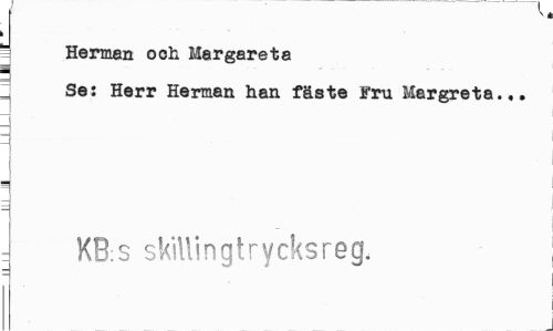 //// V.i //// a Herman ooh Margareta //// a //// _ Se: Herr Herman han fäste Fru Margreta... //// i //// KB:S skillingtrycksreg. ////