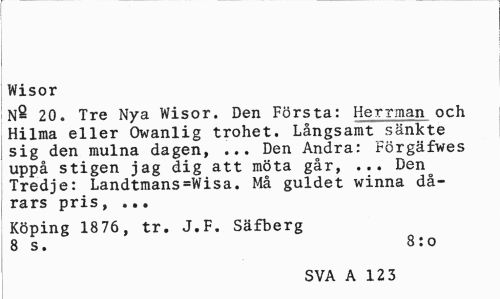 //// Wisor //// n2 20. Tre Nya Wisor. Den Första: Herrman och Hilma eller Owanlig trohet. Långsamt sänkte sig den mulna dagen, ... Den Andra: Förgäfwes uppå stigen jag dig att möta går, ... Den Tredje: Landtmans=Wisa. Må guldet winna dårars pris, ... //// Köping 1876, tr. J.F. Säfberg 8 s. 8:o //// SVA A 123 ////