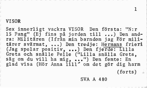 //// 1 //// VISOR //// Sex innerligt vackra VISOR Den första: "N:r 15 Pang" (Ej fins £>å jorden till ...) Den andra: Militären (Ifrån min barndom jag Hör militärer svärmat, ...) Den tredje: Hermans frieri (Jag spelar positiv, ...) Den fjerde: Lilla Greta och snälle Pelle ("Lilla snälla Greta, säg om du vill ha mig? ...") Den femte: En glad visa (Hör Anna lill" om det gör dig harm //// (forts) - //// SVA A 4 80 ////
