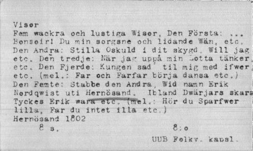 //// Visor //// Fem wackra och lustiga Wiser, Den Första; ... Bonsoi rl Du min sorgsne och lidande W&rs, etc . Den Andra; Stilla Oskuld i dit skygd. Will jag etc. Den tredje; Kär jag up^å min Lotta tänker etc. Den Fjerde: Kungen sad til min med ifwer etc, (mel,: Far och Farfar törja dansa etc./ Den Femte; otabbe den Andra, Wid namn Erik Nordqwist uti Hernoaand, Ibland Dwärjars skars //// Tyckes Erik wam1...éfeTTWal.: Hör du Sparfwer //// lilla. Far du intet illa etc) Hernoaand 1802 //// e 3. 8,0 //// UUB Fal k v „ k a v, si ////