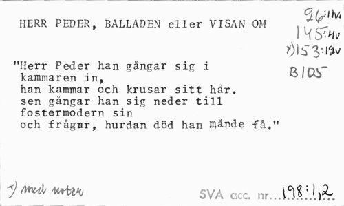 //// q&ilV' //// HERR PEDER, BALLADEN eller VISAN OM ,f* //// y)\sy\fr //// "Herr Peder han gångar sig i R I n<~ //// kammaren in, o I Ub //// han kammar och krusar sitt här. sen gångar han sig neder till fostermodern sin //// och frågar, hurdan död han månde få." i ma mm sva ccc. nr...\°\V)A ////