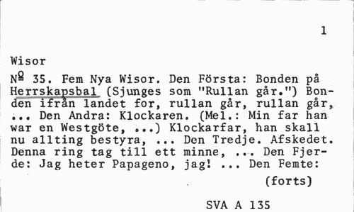 //// 1 //// Wisor //// N- 35. Fem Nya Wisor. Den Första: Bonden på Herrskapsbal (Sjunges som "Rullan går.") Bonden ifrån landet for, rullan går, rullan går, ... Den Andra: Klockaren. (Mel.: Min far han war en Westgöte, ...) Klockarfar, han skall nu allting bestyra, ... Den Tredje. Afskedet. Denna ring tag till ett minne, ... Den Fjer-de: Jag heter Papageno, jag! ... Den Femte: //// (forts) SVA A 135 ////