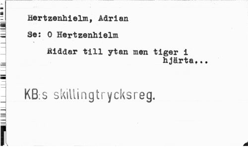//// ' Hertzenhielm, Adrian //// 1 Se: O Hertzenhielm //// I Hiddar till ytan men tiger i //// hjärta... //// KB:s skilli n g t r y eks reg. //// i ////