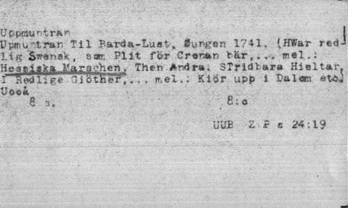 //// [JpprauntrÄw //// PpSiU atrar- Til Bard a-Lust-,, furien 1741, (HWar red -Lig-Swensk,. aorr. Plit for Grenan iDär,.,. mel.; flegsiska Faraohen . Then Andra; STridYara Hieltar» I Redlige . GiotS-eF,'.. . mel.; Kior upp i Dalam etc* Uooå //// 8-3. 8:0 //// UUB Z B c 24:19 ////
