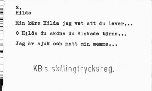 //// S 2. //// b Hilda //// Min kära Hilda jag vet att du lever... O Hilda du sköna du älskade tärna... //// 3 Jag är sjuk och matt min mamma... //// _ //// | KB s skillingtrycksreg. //// i ////