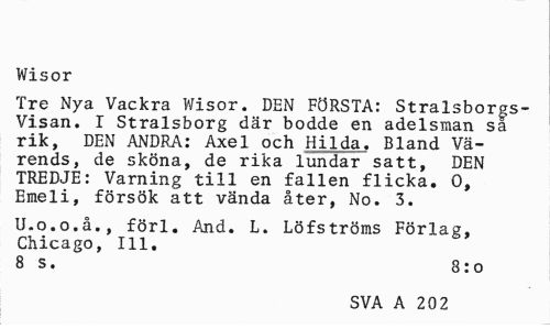 //// Wisor //// Tre Nya Vackra Wisor. DEN FÖRSTA: Stralsborgs-Visan. I Stralsborg där bodde en adelsman så rik, DEN ANDRA: Axel och Hilda. Bland Vä-rends, de sköna, de rika lundar satt, DEN TREDJE: Varning till en fallen flicka. 0, Emeli, försök att vända åter, No. 3. //// U.o.o.å., förl. And. L. Löfströms Förlag, Chicago, 111. //// 8 s. 8:o //// SVA A 202 ////