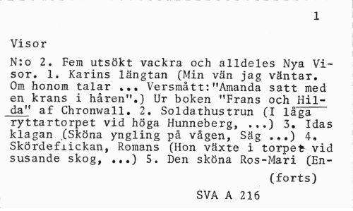 //// 1 //// Visor //// N:o 2. Fem utsökt vackra och alldeles Nya Visor. 1. Karins längtan (Min vän jag väntar. Om honom talar ... Versmått:"Amanda satt med en krans i håren".) Ur boken "Frans och Hilda" af Chronwall. 2. Soldathustrun (I låga ryttartorpet vid höga Hunneberg, ...) 3. Idas klagan (Sköna yngling på vågen, Säg ...) 4. Skördeflickan, Romans (Hon växte i torpet vid susande skog, .,.) 5. Den sköna Ros-Mari (En- //// (forts) //// SVA A 216 ////
