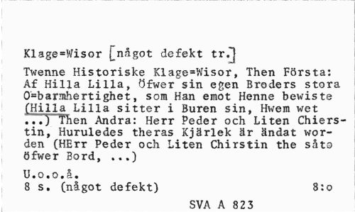 //// Klage=Wisor [något defekt tr.^j //// Twenne Historiske Klage^Wisor, Then Första: Af Hilla Lilla, Öfwersin egen Broders stora 0=barmhertighet, som Han emot Henne bewiste (Hilla Lilla sitter i Buren sin, Hwem wet ...1 Then Andra: Herr Peder och Liten Chiers-tin, Huruledes theras Kjärlek är ändat wor-den (HErr Peder och Liten Chirstin the såto öfwer Bord, ...) //// U.o.o.å. //// 8 s. (något defekt) 8:0 //// SVA A 82 3 ////