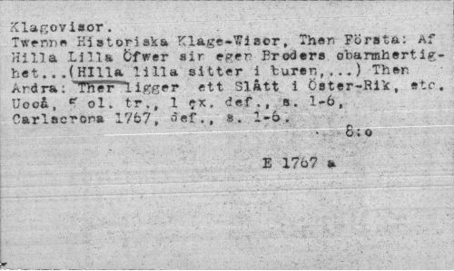 //// Klagovisor. //// Twervrm Historiska Klage-Tiser, Thor. Första; Af Hilla Lilla öfwer sir eper Broders obarmhertig-het.. . (Hllla lilla sitter i turer,,...) Ther Ardra: Tfter ligger ett Slått i Cster-Rik, etc. Uooå, e ol. tr., 1 def., a. 1-6, Carlaerona 1767, def., s. 1-6. //// 8; o //// E 176? a //// r ////