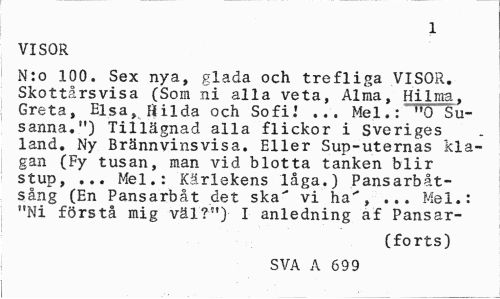 //// 1 //// VISOR //// N:o 100. Sex nya, glada och trefliga VISOR. Skottårsvisa (Som ni alla veta, Alma, Hilma, Greta, Elsa, Hilda och Sofi.' ... Mel.: "O Su-sanna.") Tillägnad alla flickor i Sveriges land. Ny Brännvinsvisa. Eller Sup-uternas klagan (Fy tusan, man vid blotta tanken blir stup, ... Mel.: Kärlekens låga.) Pansarbåt-sång (En Pansarbåt det ska' vi ha", ... Mel.: "Ni förstå mig väl?") I anledning af Pansar- //// (forts) //// SVA A 699 ////